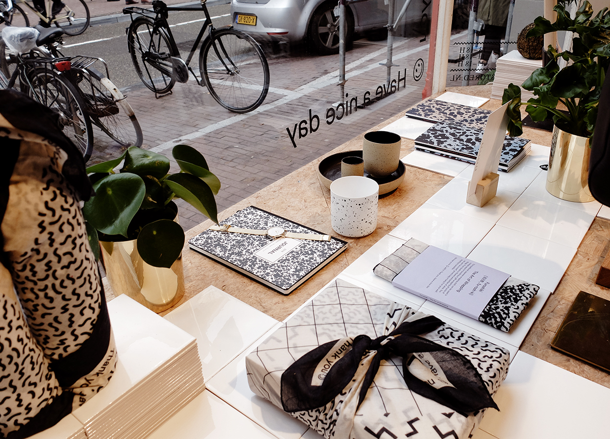 We designed the fall-window display of RESTORED in order to celebrate their recent collaboration with Aleks Pietrzykowska: Furoshiki. She created a contemporary interpretation of this traditional Japanese wrapping cloth. Furoshiki opened our eyes to the endless possibilities contained in a single piece of fabric. We made flags to symbolize a Restored-clan.