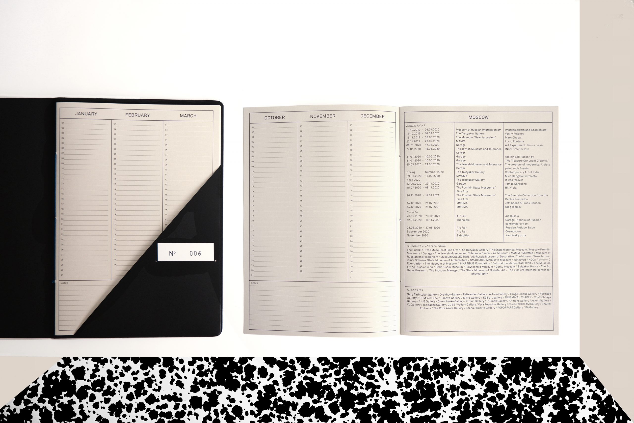 The supplemented booklet is completely redesigned for LOBBY MOSCOW. The Art Booklet is a 12 pages booklet with the eight biggest cities in Arts & Culture and their ten must sees of 2020. We added a year overview that will allow you to schedule and plan your vacation or business trip without missing the main art events. The ‘Lobby’ Booklet will be printed on a navy blue thread.